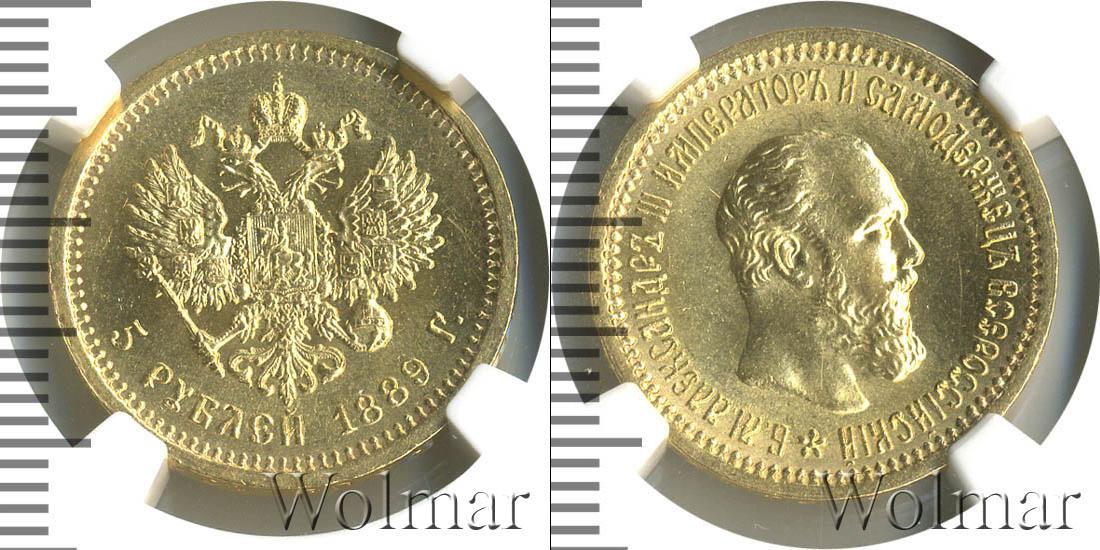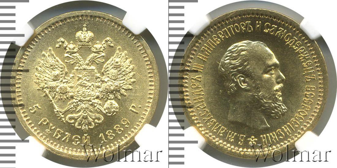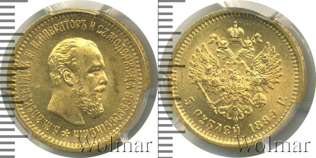 Одна из золотых монет Александра Третьего. Масса составила 6,45 г., а диаметр равен 21,3 мм. В центре расположено изображение герба Российской Империи. В нижней части указан номинал и дата выпуска монеты: 5 РУБЛЕЙ 1889 Г.