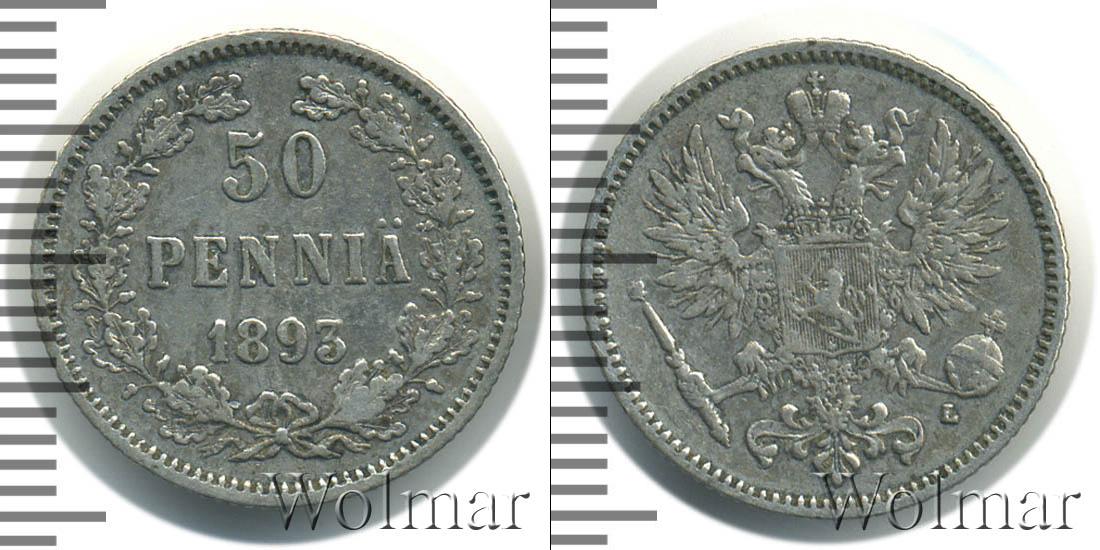 Большую часть диска занимает узор из двух дубовых ветвей, скрепленных ленточным бантом. В центре сверху-внизу указаны номинал и дата эмиссии монеты: 50 PENNIA 1893. Вдоль канта идет зубчатый орнамент (как и с лицевой стороны).