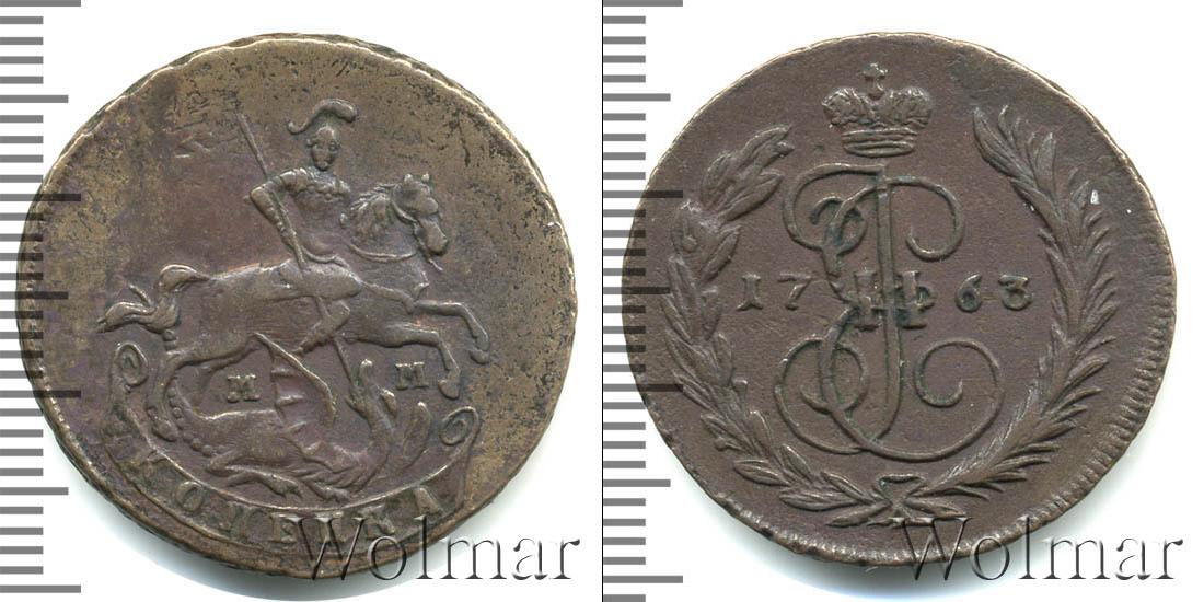 Вензельное изображение императрицы Екатерины Второй. Его венчает Большая корона Российской Империи, а внизу узор из лавровой и пальмовой ветвей. На диске указана дата чеканки монеты «1763».