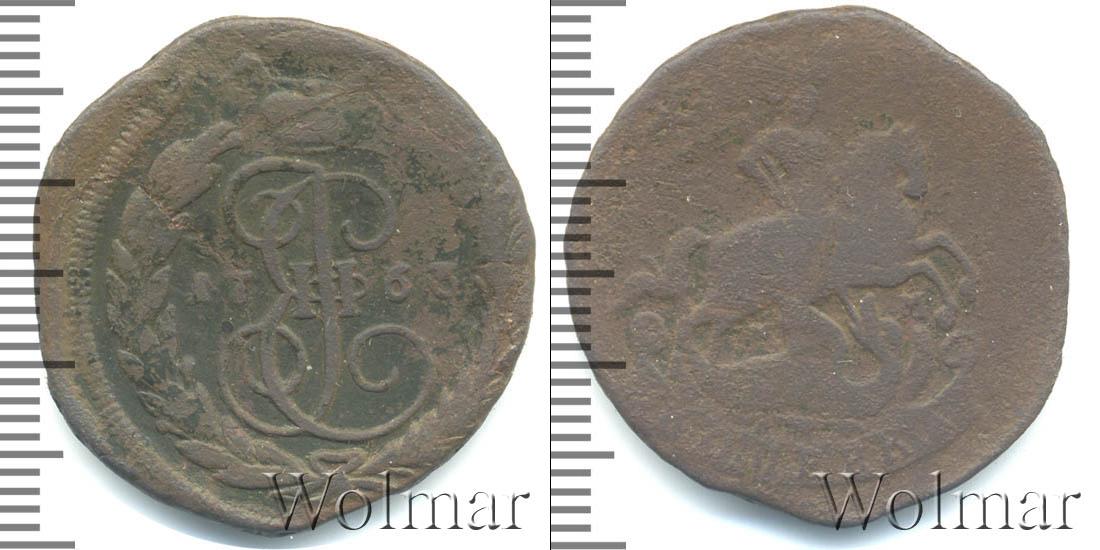 Вензельное изображение императрицы Екатерины Второй. Его венчает Большая корона Российской Империи, а внизу узор из лавровой и пальмовой ветвей. На диске указана дата чеканки монеты «1763».