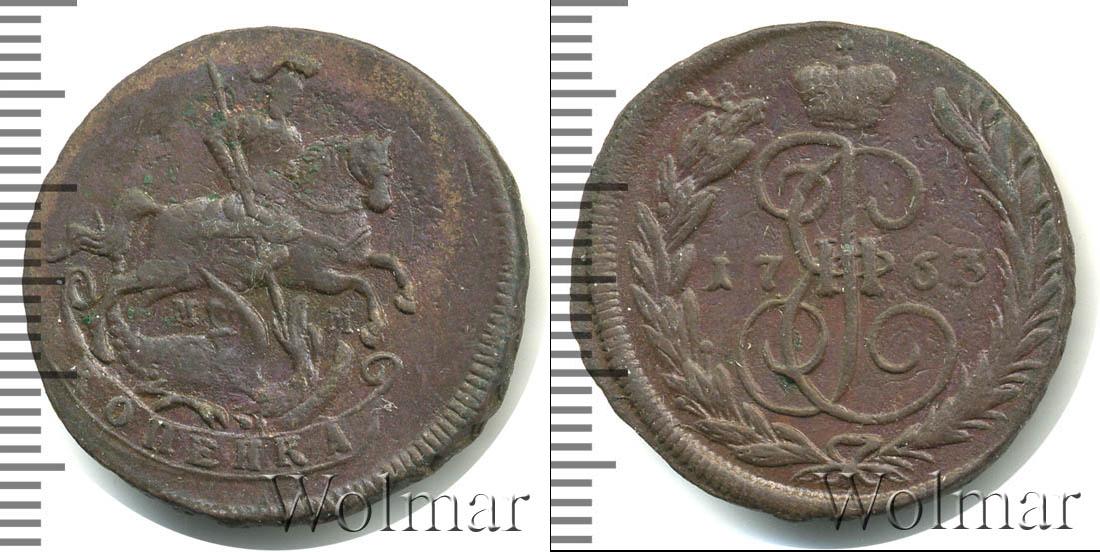 Вензельное изображение императрицы Екатерины Второй. Его венчает Большая корона Российской Империи, а внизу узор из лавровой и пальмовой ветвей. На диске указана дата чеканки монеты «1763».