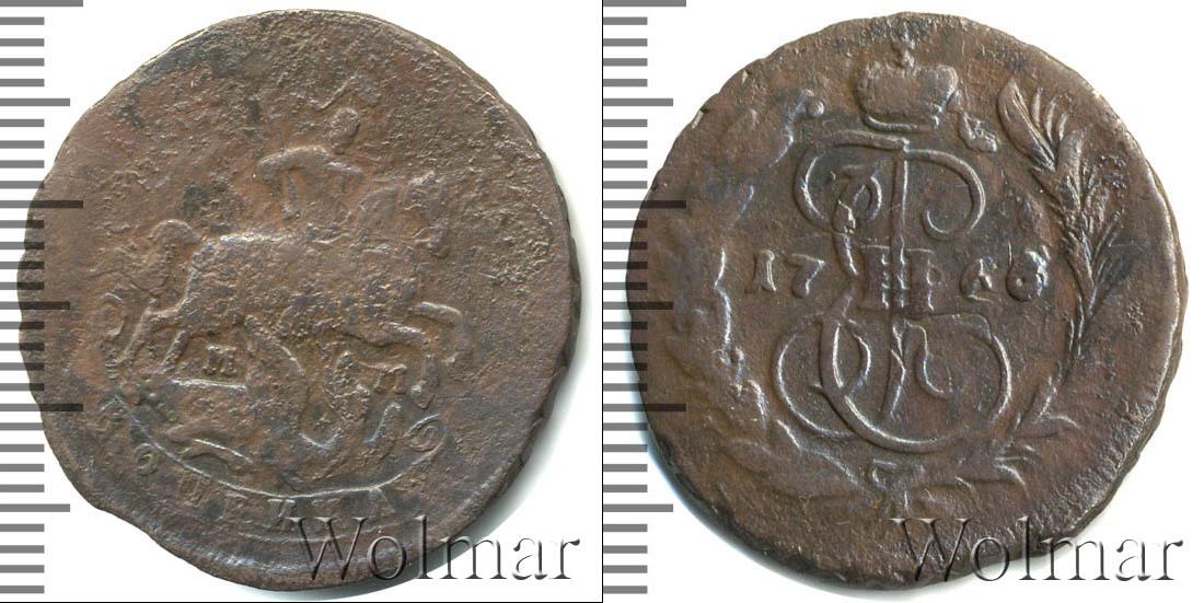 В нижней части диска изображен венок из лавровой и пальмовой ветвей (перевязанных лентой). В центре вензель императрицы Екатерины Великой, разделяющий надпись «1766». Это отметка о дате эмиссии партии.