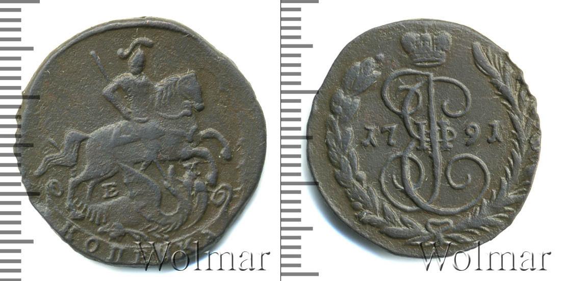 Медная монета, в центре которой расположен вензель императрицы Екатерины Великой. Над ним Императорская корона России. Также по центру отмечена дата эмиссии «1791», а внизу стилизованное изображение лавровой и пальмовой ветвей.
