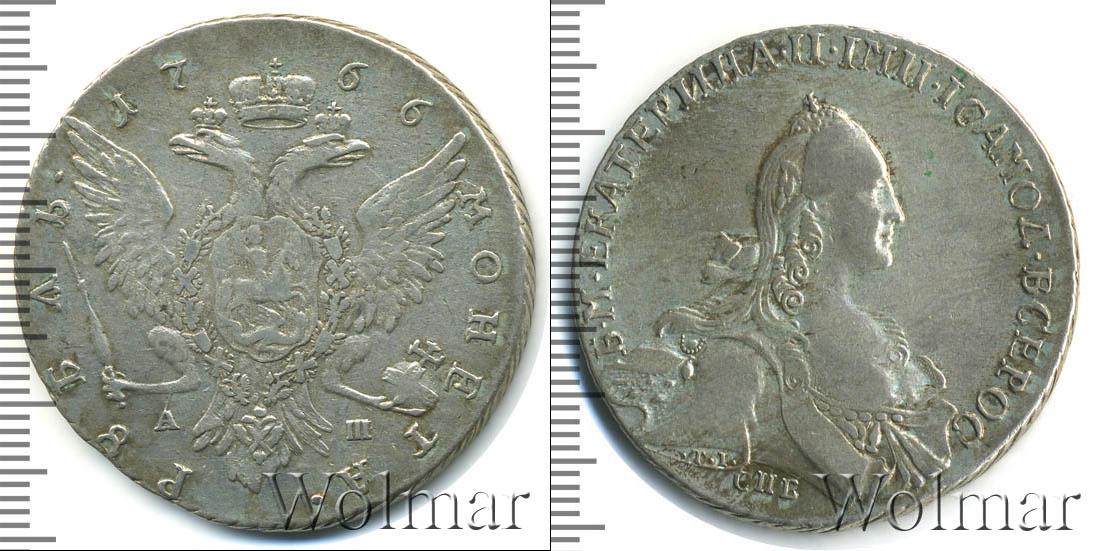 Объемное изображение имперской короны расположено вверху. Крылья двуглавого орла расправлены, в лапах – скипетр и держава. С двух сторон от хвоста государственной эмблемы выгравирована аббревиатура «АШ» - инициалы Алексея Шнезе, минцмейстера эмиссии. Номинал полукругом написан внизу композиции «МОНЕТА РУБЛЬ». Год тиража занимает место вдоль верхнего края - «1766».