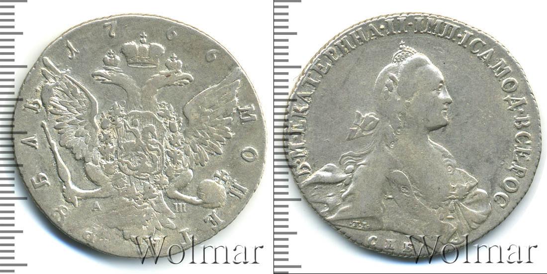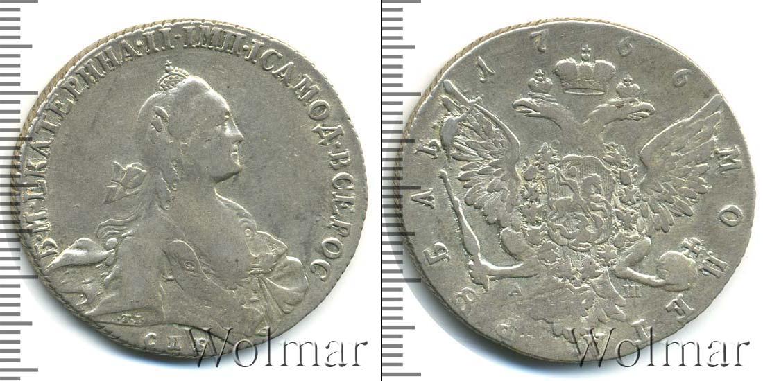 Объемное изображение имперской короны расположено вверху. Крылья двуглавого орла расправлены, в лапах – скипетр и держава. С двух сторон от хвоста государственной эмблемы выгравирована аббревиатура «АШ» - инициалы Алексея Шнезе, минцмейстера эмиссии. Номинал полукругом написан внизу композиции «МОНЕТА РУБЛЬ». Год тиража занимает место вдоль верхнего края - «1766».