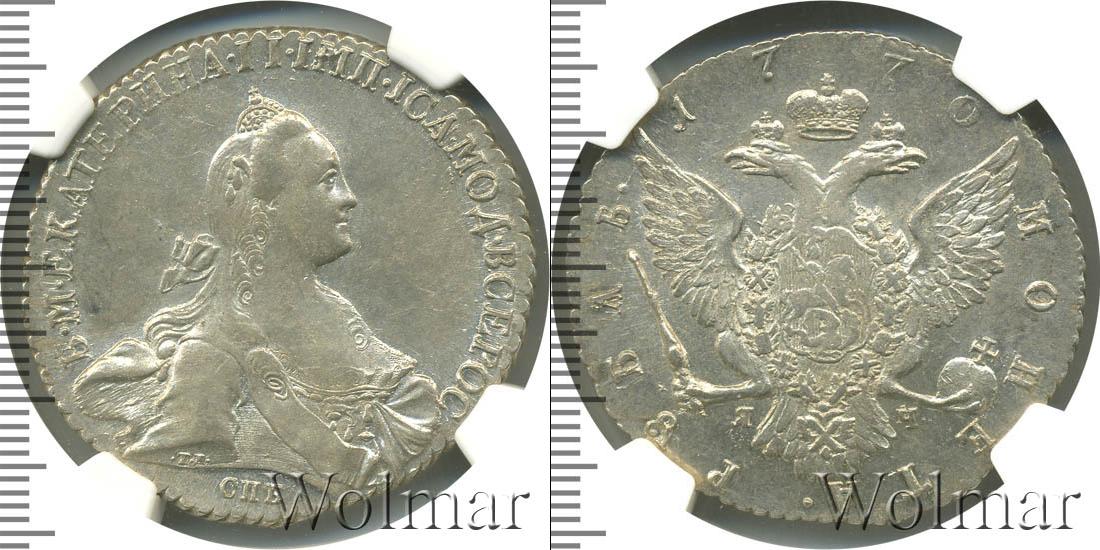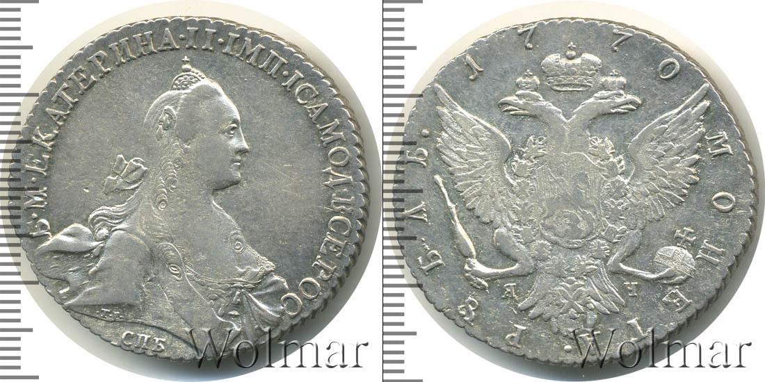 В одной из лап коронованный двуглавый орел держит скипетр, в другой – державу. Инициалы минцмейстера «ЯЧ» Якова Чернышова выгравированы возле хвоста коронованного двуглавого орла внизу легенды. Круговая надпись «1770 * МОНЕТА * РУБЛЬ» окружает композицию.