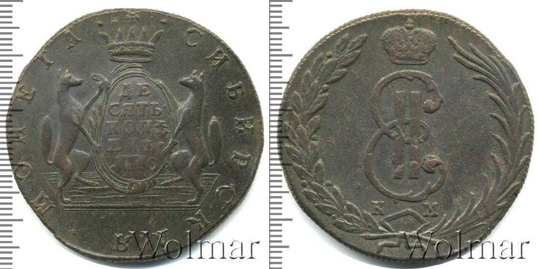 С оборотной стороны монеты картуш, удерживаемый соболями. На нем указаны номинал и год выпуска партии «ДЕСЯТЬ КОПЕЕК 1770». Вверху корона, а над ней крест. Вдоль канта слева и справа части надписи «МОНЕТА» и «СИБИРСКАЯ».