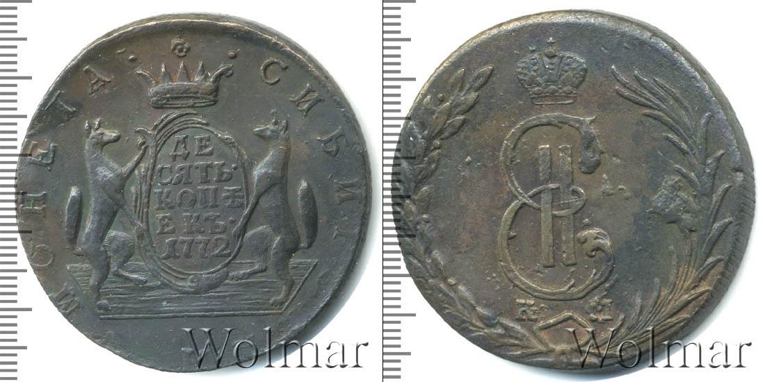 В центре изображен картуш с отметками о номинале и дате эмиссии монеты. Сверху вниз начертаны слова: «ДЕСЯТЬ КОПЕЕК 1772». Картуш удерживают два соболя. Вверху мы видим корону, а справа и слева от этого изображения расположена надпись: «МОНЕТА СИБИРСКАЯ».
