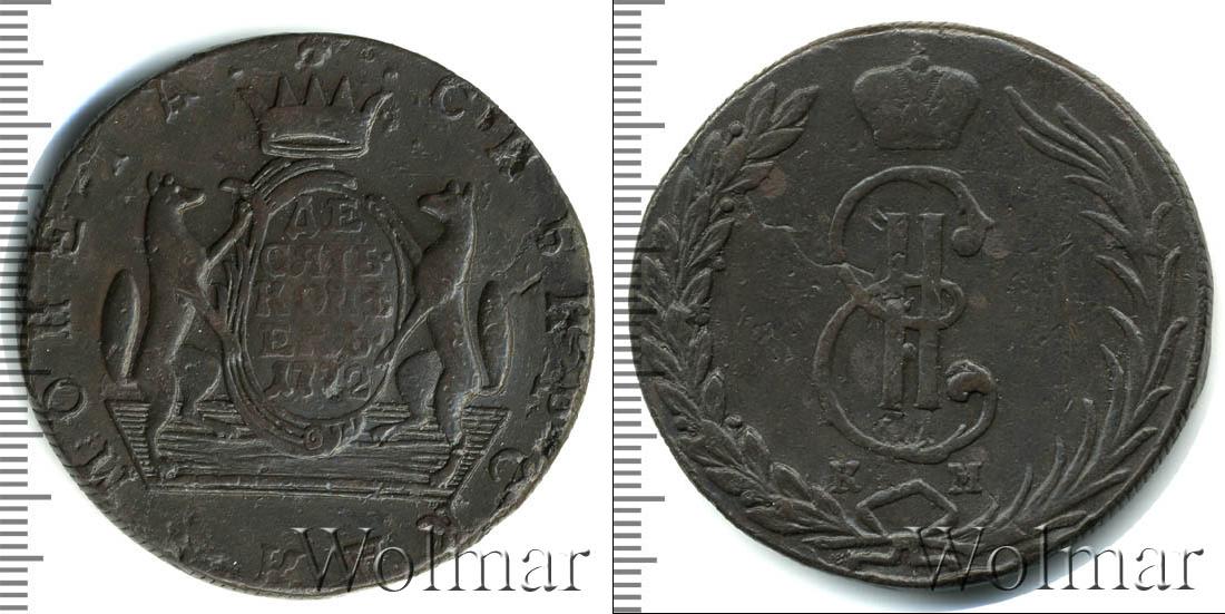 Край диска монеты оформлен в виде точечного узора. Он обрамляет изображение вензеля Екатерины Великой и Большой короны Российской Империи. В центре указан монетный двор «К.М.», а внизу изображены лавровая и пальмовая ветви.