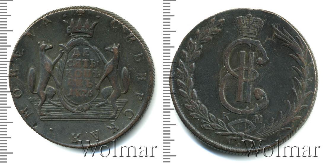 Картуш, удерживаемый двумя соболями. Внутри картуши выгравировано: ДЕСЯТЬ КОПЕЕК 1776. Это указание на номинал и дату эмиссии монеты. Вверху мы видим Императорскую корону России. Вдоль канта слева и справа расположена надпись: «МОНЕТА СИБИРСКАЯ».