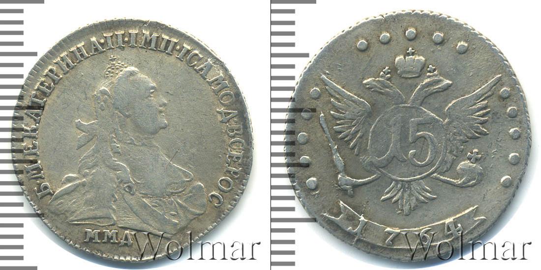 Детально показан герб Российской Империи. На груди орла щит с номиналом монеты «15». Вдоль края 20 точек - по 5 слева и справа от крыльев в средней части, и по 5 слева и справа от короны в верхней части монеты. Внизу изображена лента с годом чеканки монеты «1764».