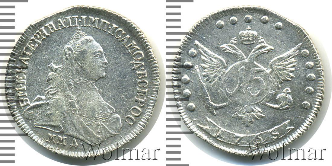 С этой стороны монеты в центре диска расположен портрет императрицы Екатерины Второй с соответствующей надписью (вверху): Б.М.ЕКАТЕРИНА.II.ИМП.ИСАМОД.ВСЕРОС. Внизу отмечен монетный двор «ММД».