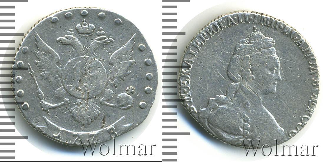 Серебряная монета массой 3,56 г. и диаметром 22 мм. По центру портрет Екатерины Великой. Вверху мы видим надпись: Б.М.ЕКАТЕРИНА.II.ИМП.ИСАМОД.ВСЕРОС, а ниже указан монетный двор «СПБ».
