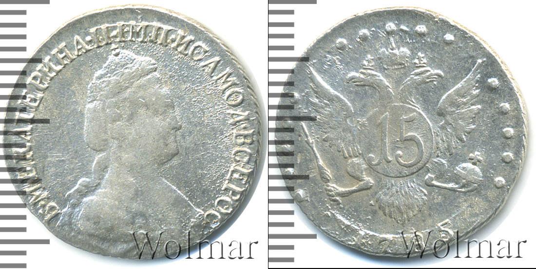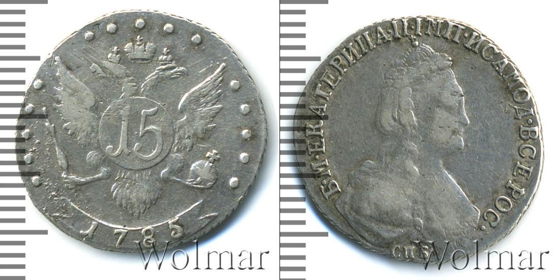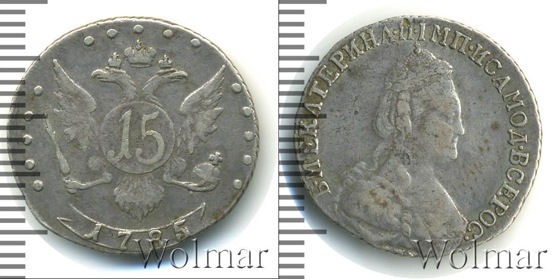 Изображение двуглавого орла со скипетром и державой – герб Российской Империи. На щите двуглавого орла указан номинал – 15. Внизу сделана отметка о дате эмиссии «1785». По краю диска (слева и справа) идет узор из пяти точек.
