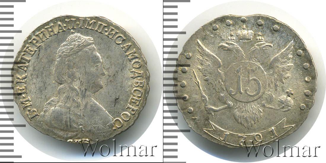 В центре изображен гербовый двуглавый орел, а вверху отчеканены 10 точек (по 5 слева и справа от короны). На груди орла указан номинал монеты «15». Внизу полукругом идет лента с годом чеканки партии «1791».