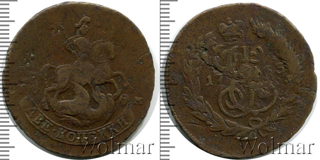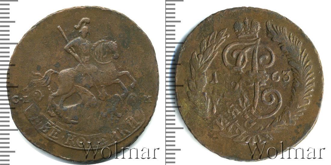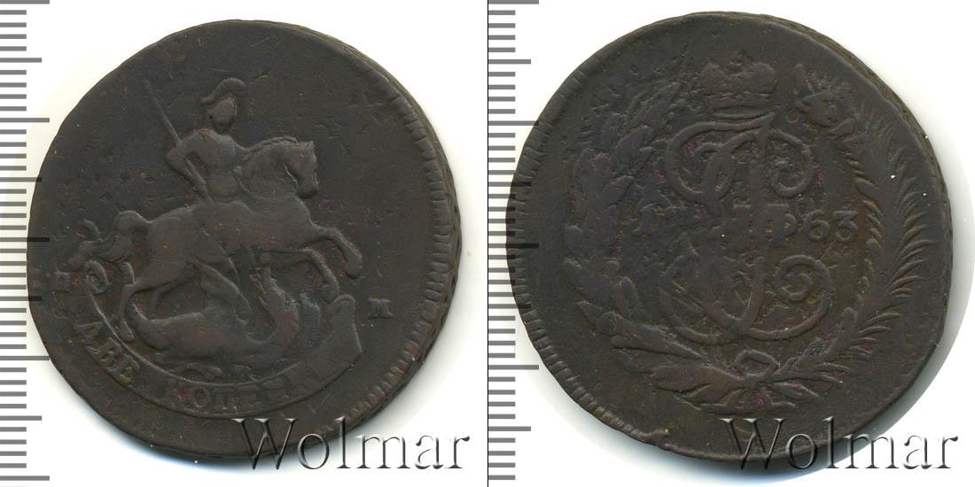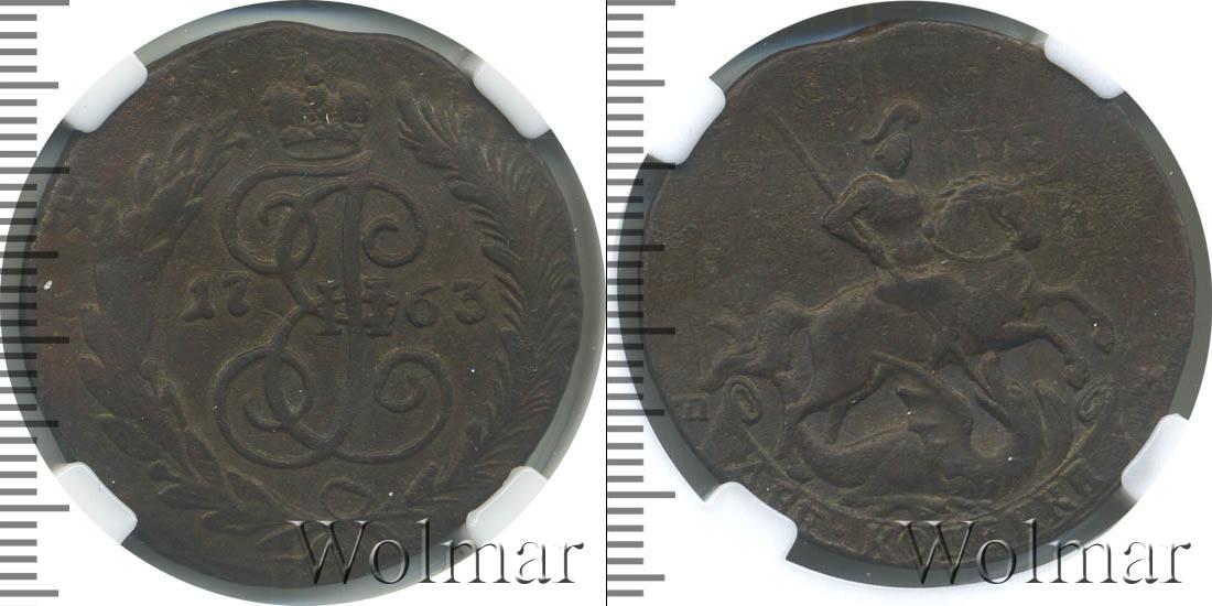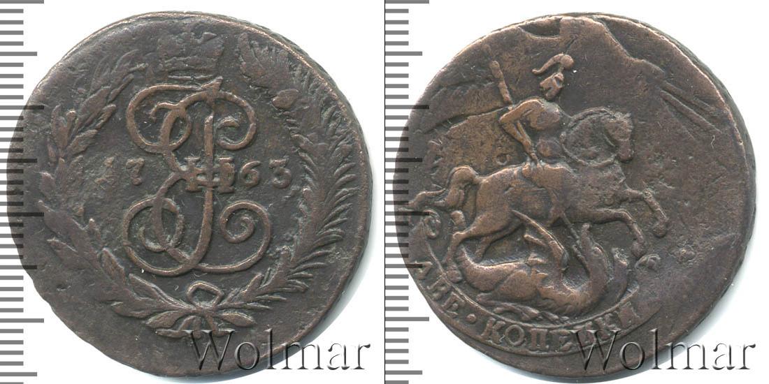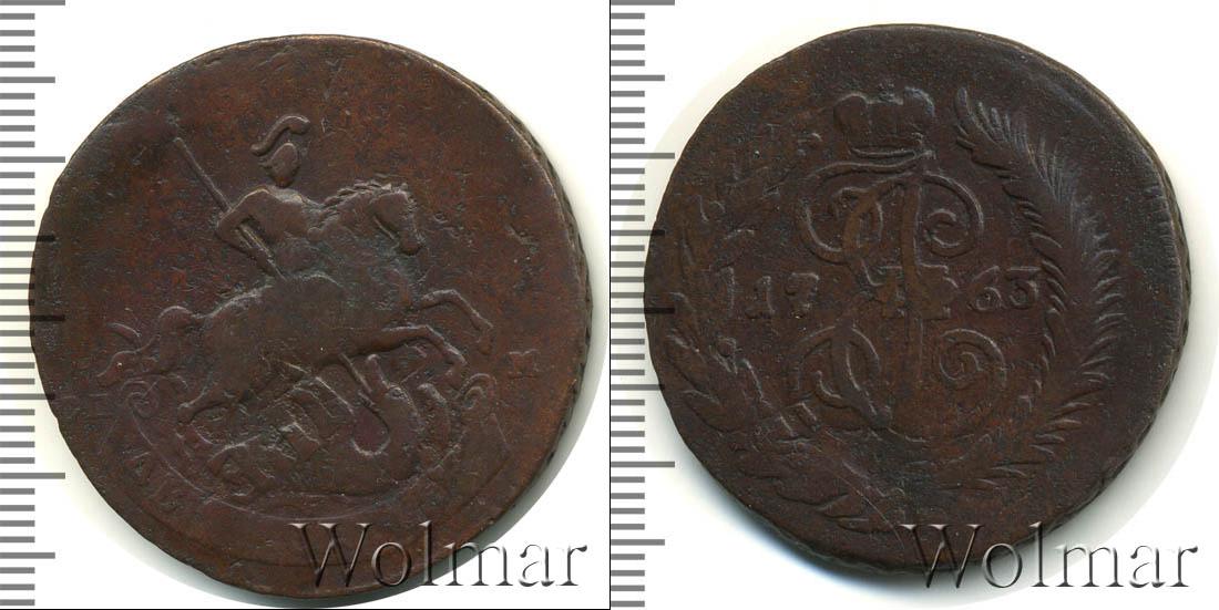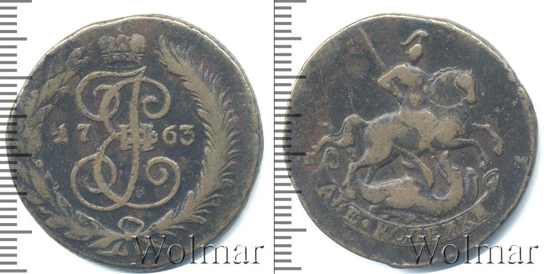 Большую часть диска монеты занимает детально прорисованный вензель императрицы Екатерины Второй. Над ним Императорская корона России. В центре отмечена дата эмиссии «1763», а внизу узор из лавровой и пальмовой ветвей.