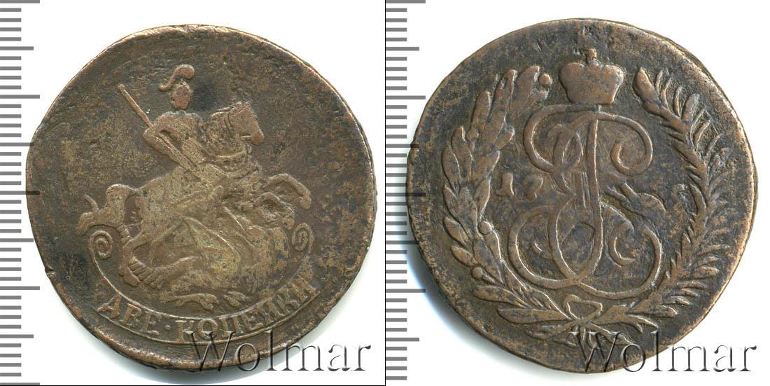 С оборотной стороны монеты вензельное изображение императрицы Екатерины Второй. Его венчает Большая корона Российской Империи, а внизу нанесен узор из лавровой и пальмовой ветвей. На диске монеты указана дата чеканки «1765».