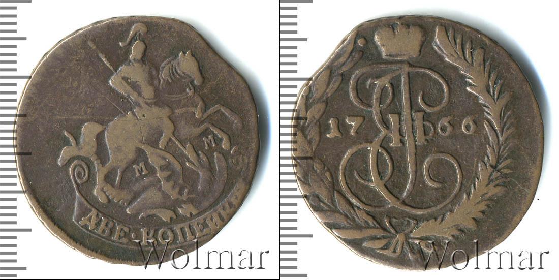 По центру диска изображен вензель Екатерины Великой. Он разделяет отметку о дате эмиссии монеты «1766». Вверху расположена Императорская корона России, а внизу узор из лавровой и пальмовой ветвей.