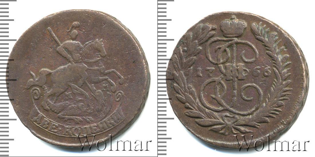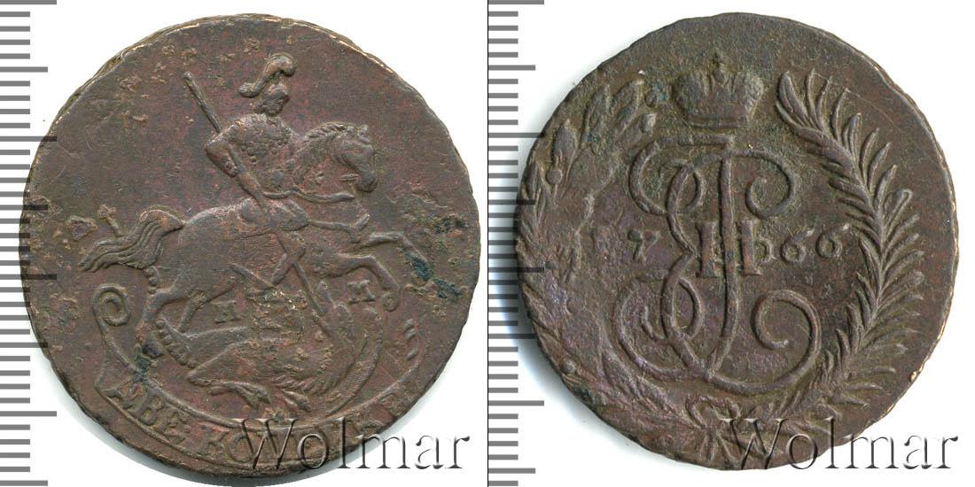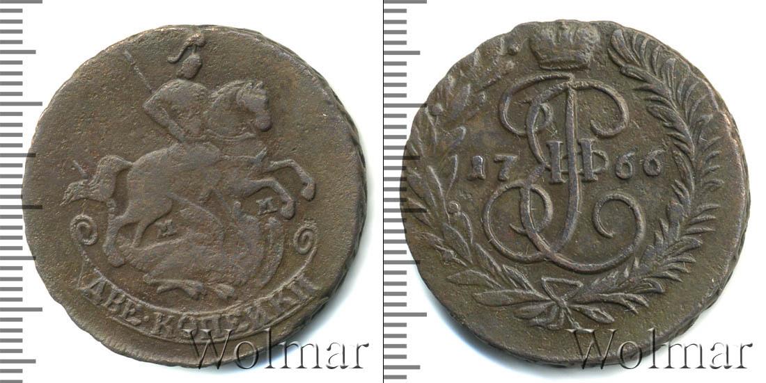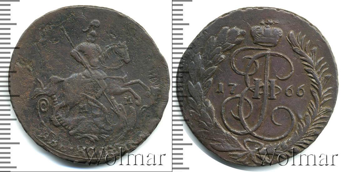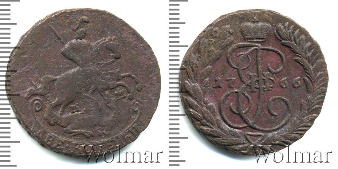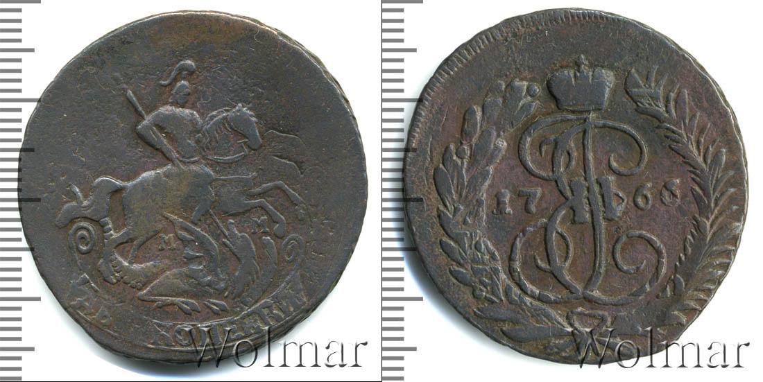 По центру диска изображен вензель Екатерины Великой. Он разделяет отметку о дате эмиссии монеты «1766». Вверху расположена Императорская корона России, а внизу узор из лавровой и пальмовой ветвей.
