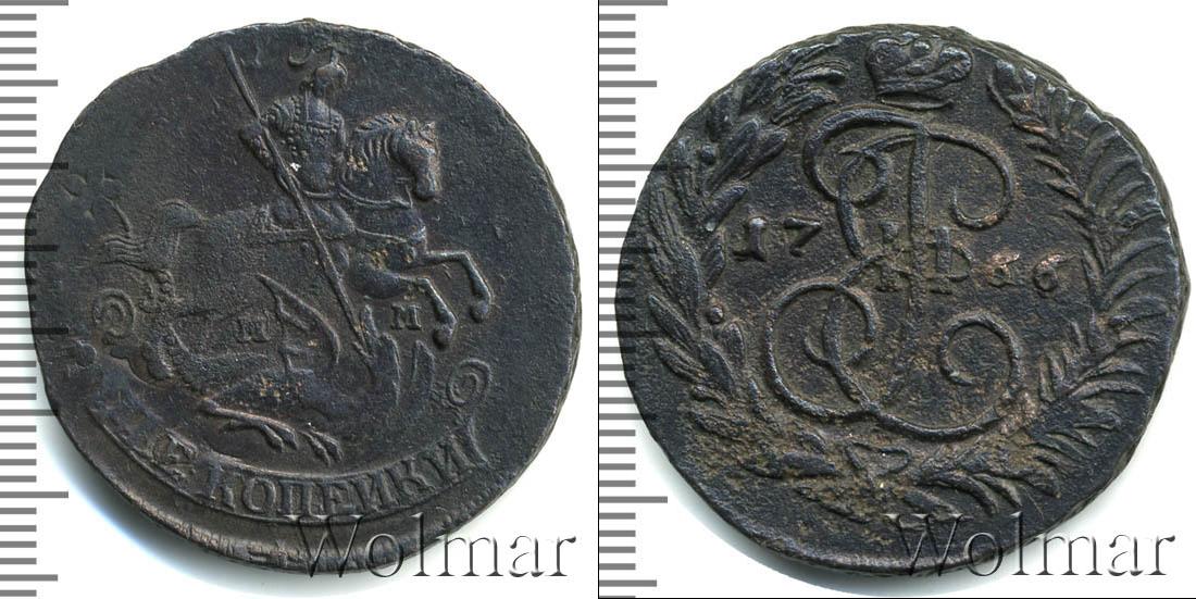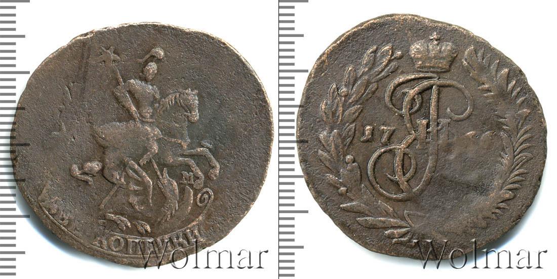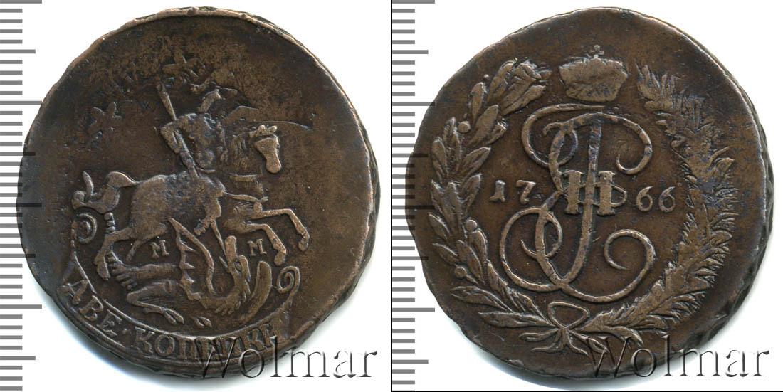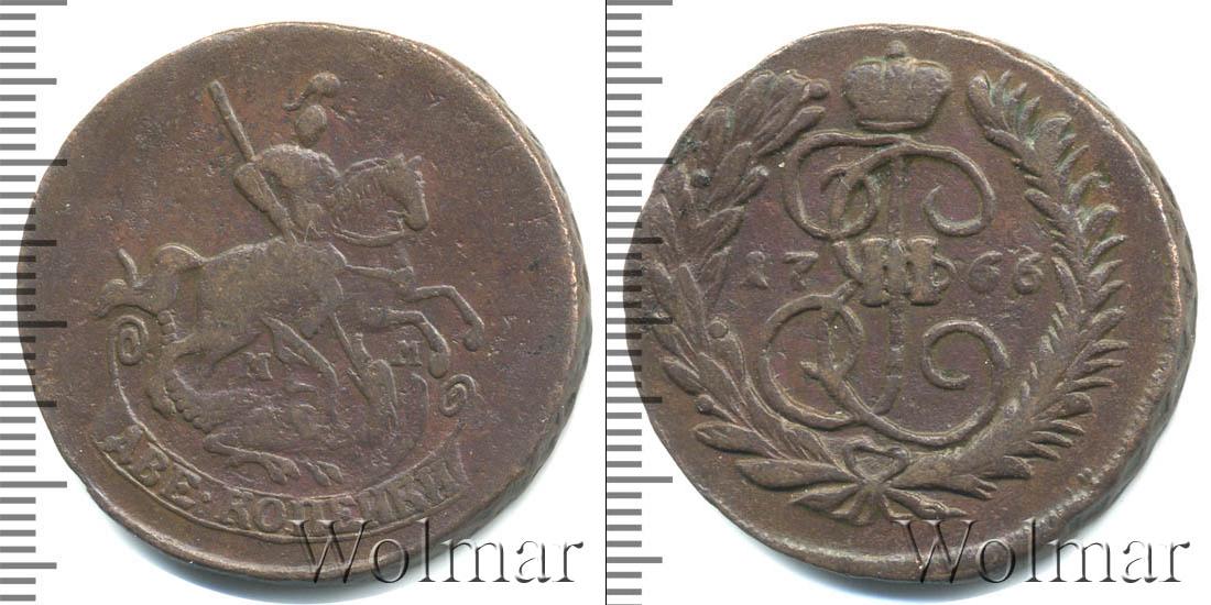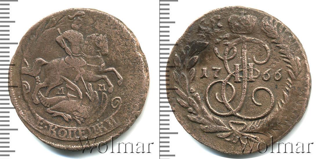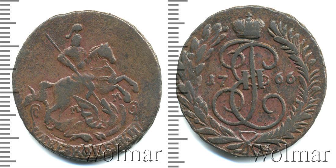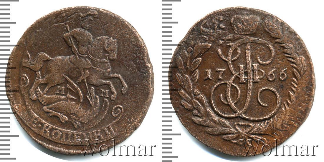 По центру диска изображен вензель Екатерины Великой. Он разделяет отметку о дате эмиссии монеты «1766». Вверху расположена Императорская корона России, а внизу узор из лавровой и пальмовой ветвей.