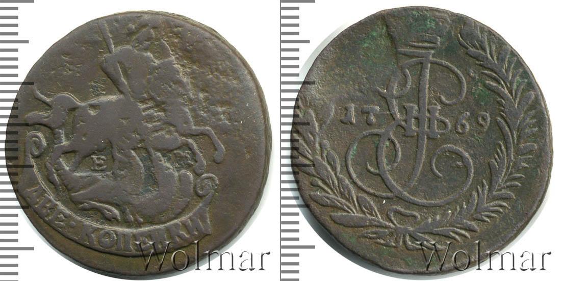 В нижней части диска узор из лавровой и пальмовой ветвей (перевязанных лентой). В центре показан вензель императрицы Екатерины Великой, разделяющий надпись «1769». Это отметка о дате эмиссии партии.