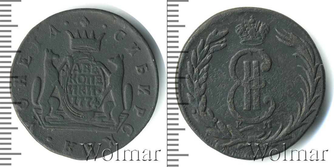 В центре изображен картуш, где выгравировано «ДВЕ КОПЕЙКИ 1774». Таким образом сделаны отметки о номинале и дате чеканки монеты. Над щитом мы видим корону, а слева и справа двух соболей. Также на диске расположена надпись: «МОНЕТА СИБИРСКАЯ».
