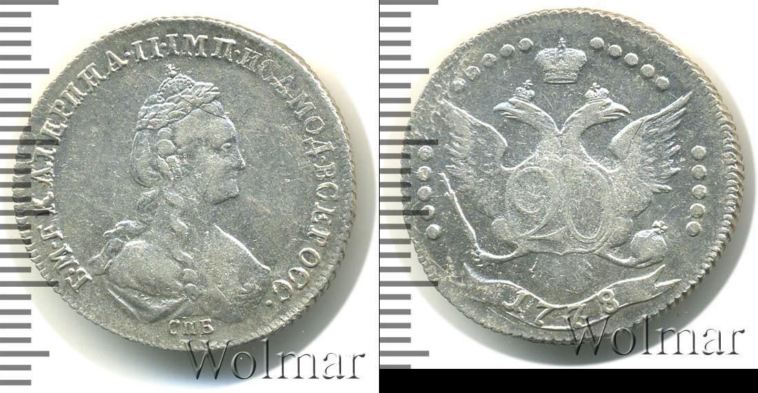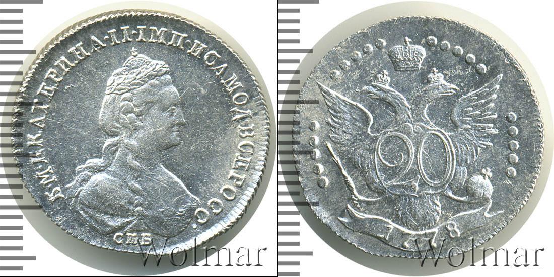 В центральной части диска герб Российской Империи с отчеканенным на груди номиналом монеты «20». По краю 20 точек, равномерно разделенные крыльями и короной орла. В нижней части по краю идет лента, на которой выбит год эмиссии монеты «1778».
