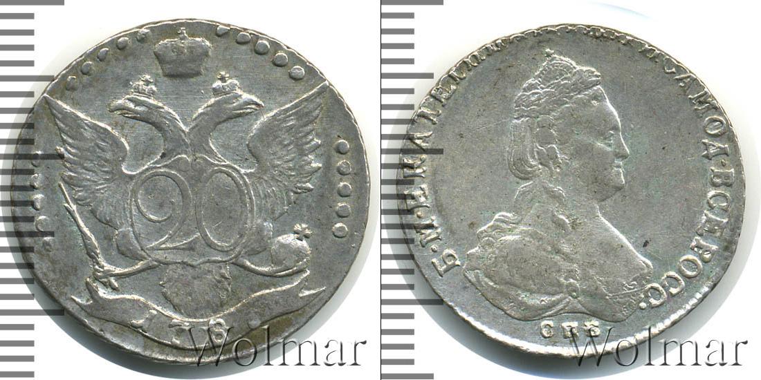 С оборотной стороны монеты изображен герб Российской Империи. Вверху слева и справа узор из пяти точек. На щите двуглавого орла отметка о номинале «20», а внизу на ленте отчеканена дата эмиссии «1787».