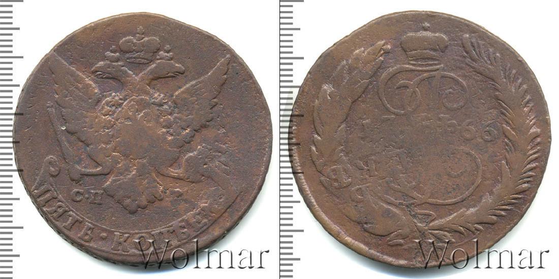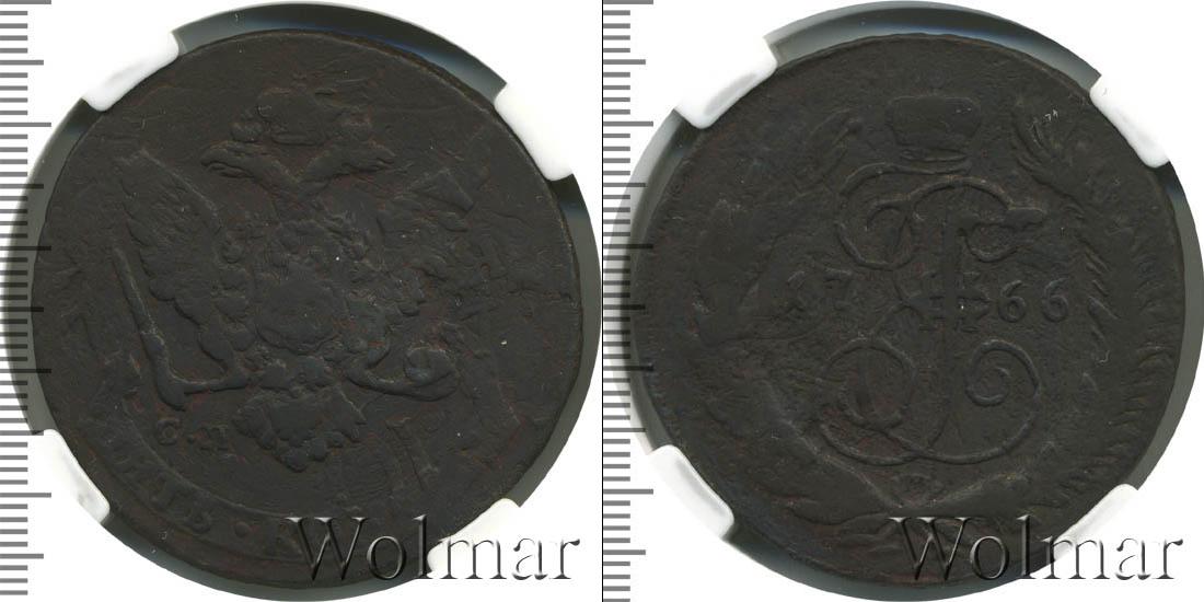 По центру изображен вензель Екатерины Великой. Он разделяет отметку о дата эмиссии монеты «1766». Вверху расположена Императорская корона России, а внизу узор из лавровой и пальмовой ветвей.