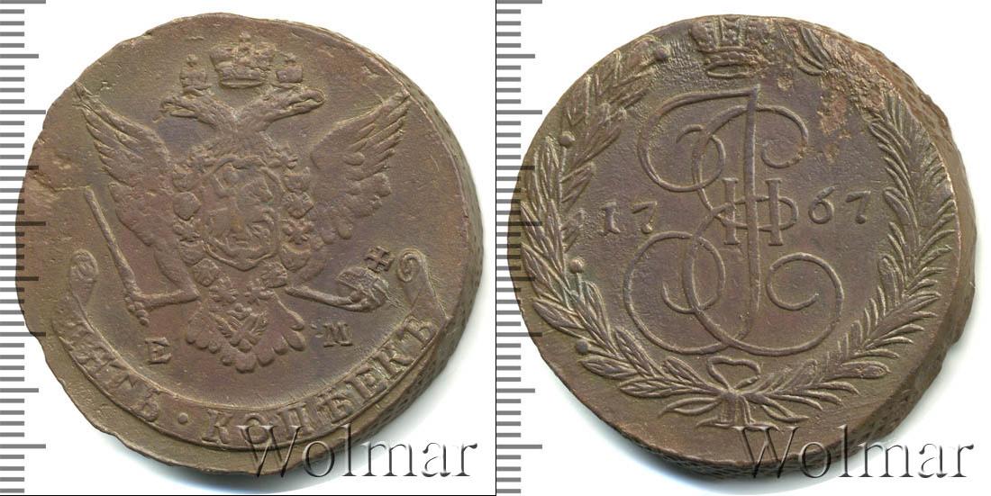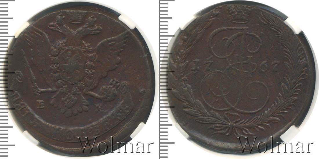 Вензель императрицы Екатерины Великой из династии Романовых. Над ним Большая корона Российской Империи. По центру отмечен год выпуска партии монет «1767». Внизу скрепленные лентой лавровая и пальмовая ветви.