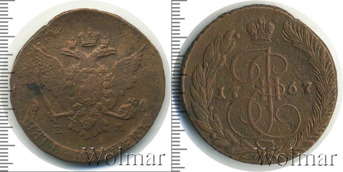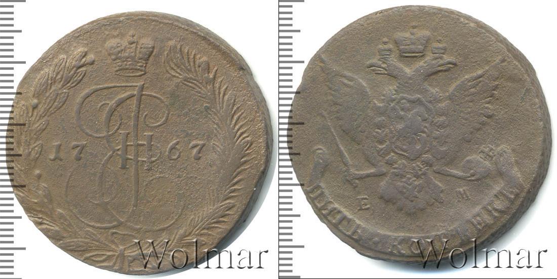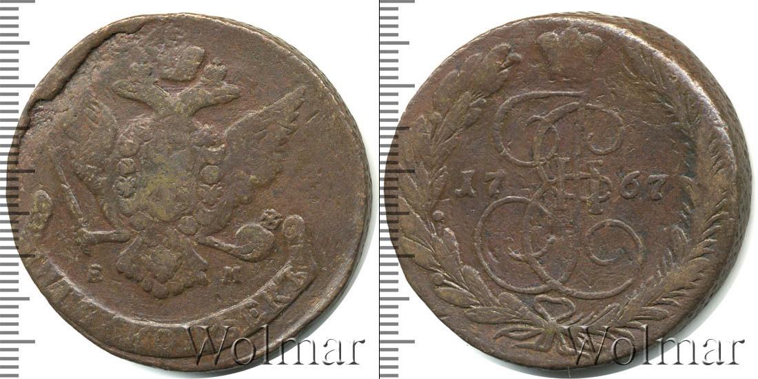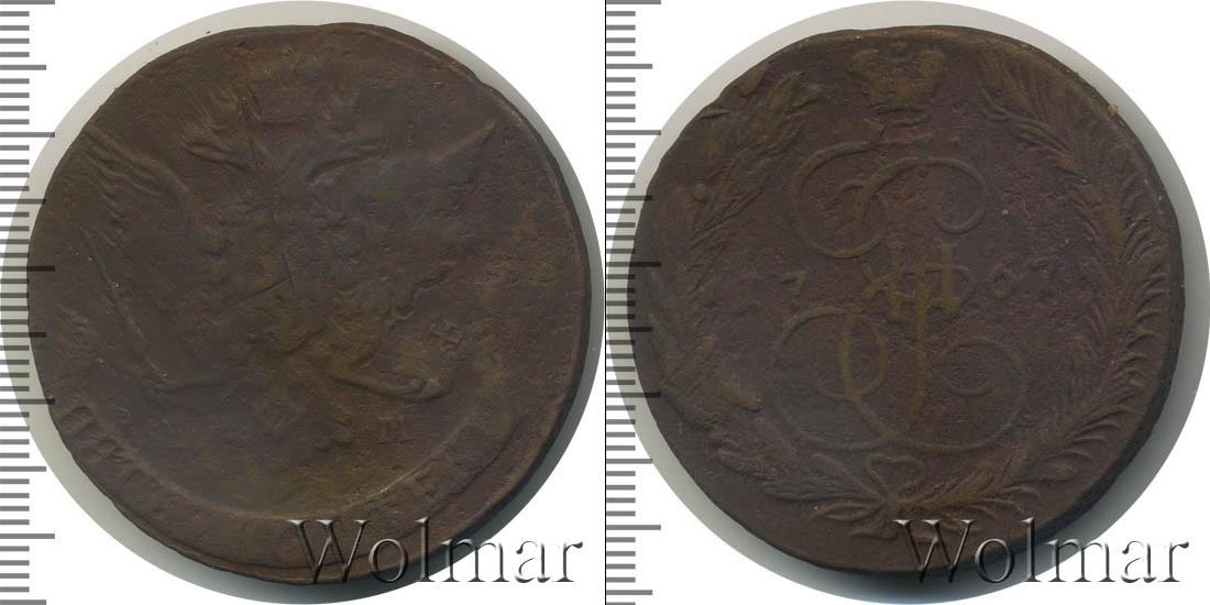 Вензель императрицы Екатерины Великой из династии Романовых. Над ним Большая корона Российской Империи. По центру отмечен год выпуска партии монет «1767». Внизу скрепленные лентой лавровая и пальмовая ветви.