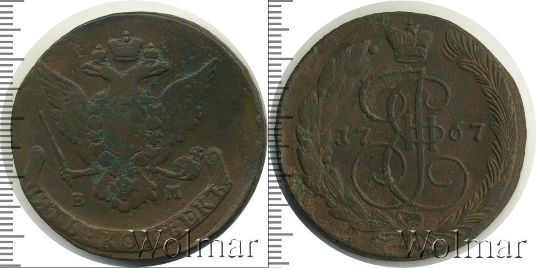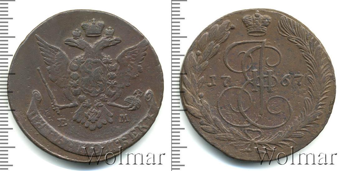 Вензель императрицы Екатерины Великой из династии Романовых. Над ним Большая корона Российской Империи. По центру отмечен год выпуска партии монет «1767». Внизу скрепленные лентой лавровая и пальмовая ветви.