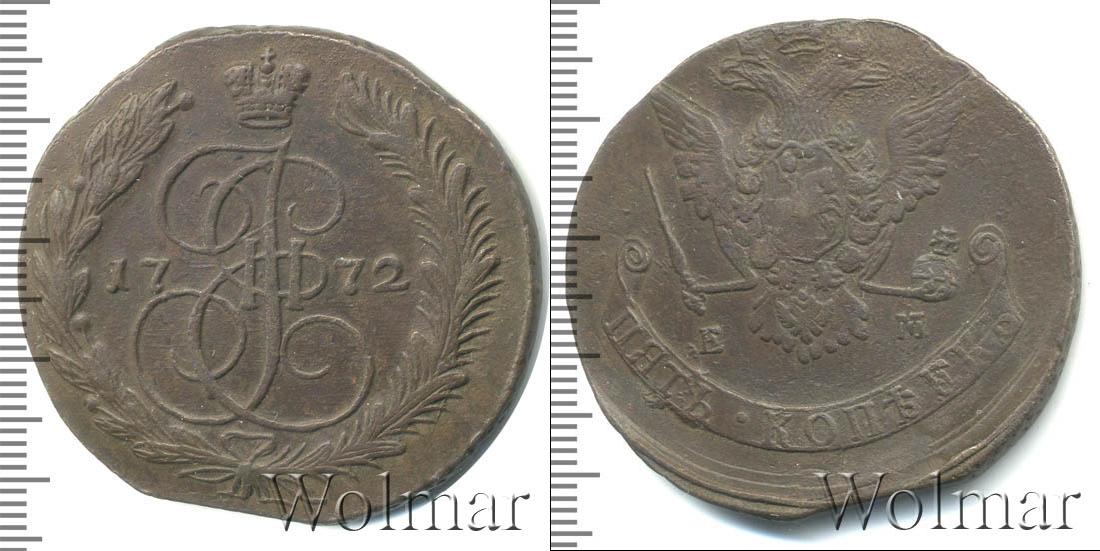 Медная монета с изображением Государственного герба Российской Империи (второй половины девятнадцатого века). Внизу по краю расположена лента с отметкой о номинале «ПЯТЬ КОПЕЕК». Также внизу указание на монетный двор «ЕМ».