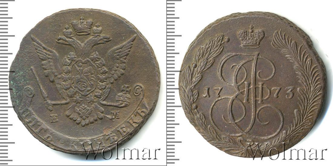 По центру изображен вензель Екатерины Великой – Большая буква «Е» и римская II. Он разделяет отметку о дате эмиссии монеты «1773». Вверху расположена Императорская корона России. Лавровая и пальмовая ветви обрамляют композицию по краям и сплетаются внизу при помощи банта.