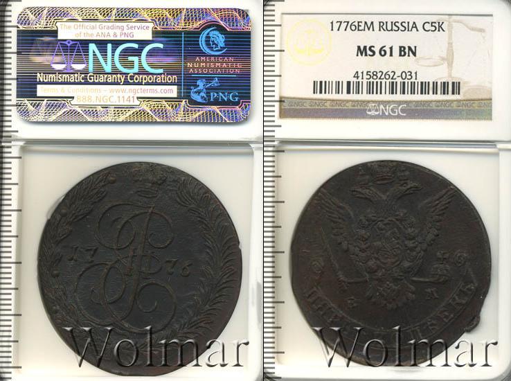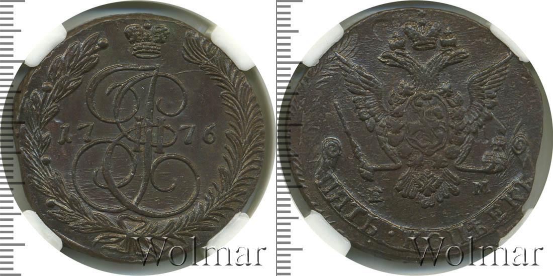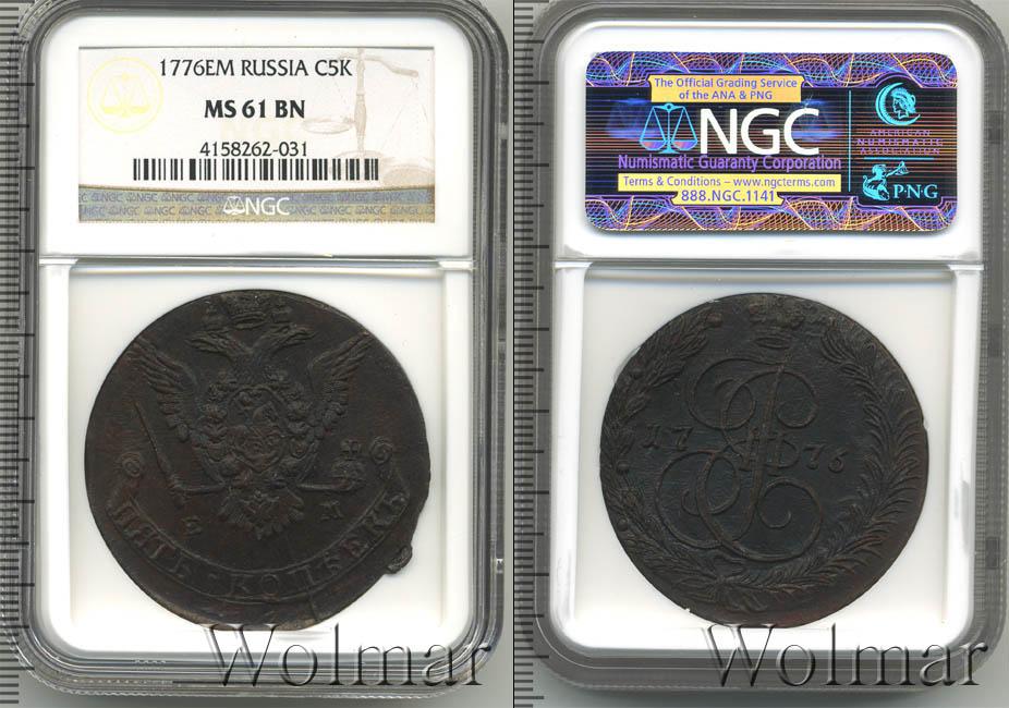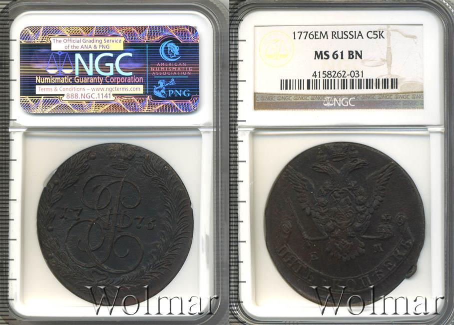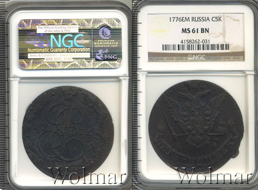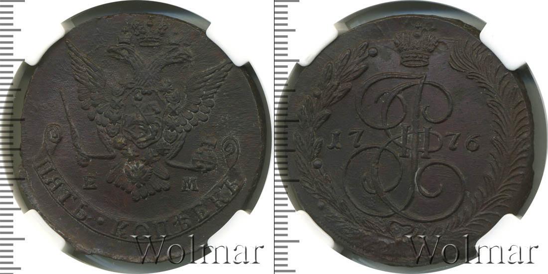 В слабе NGC. Екатеринбургский монетный двор. Биткин №# 661.625, "орёл образца 1770-1777 гг.", тираж 21 454 000, Уздеников №# 2739. По каталогу Wolmar # 155/24. 5 копеек ЕМ