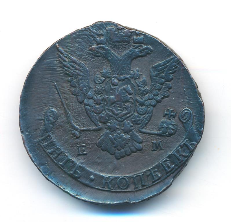 Екатеринбургский монетный двор. Биткин №# 661.625, "орёл образца 1770-1777 гг.", тираж 21 454 000, Уздеников №# 2739. Wolmar # 155/24. 5 копеек ЕМ