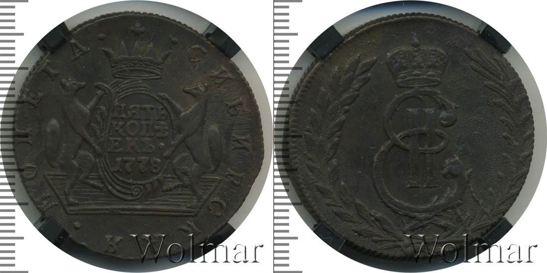 С этой стороны монеты отчеканен картуш, удерживаемый соболями. На нем указаны номинал и год выпуска партии «ПЯТЬ КОПЕЕК 1778». Вверху корона, а над ней крест. Вдоль канта слева и справа части надписи «МОНЕТА» и «СИБИРСКАЯ».