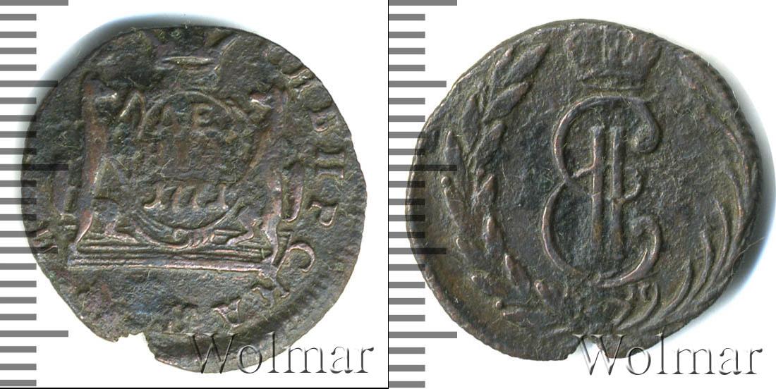 Слева вдоль канта выгравировано: «МОНЕТА», а справа «СИБИРСКАЯ». В центре мы видим двух соболей, удерживающих щит. На нем указаны номинал и дата эмиссии партии «ДЕНГА 1771». Вверху по центру изображен крест, а под ним корона.