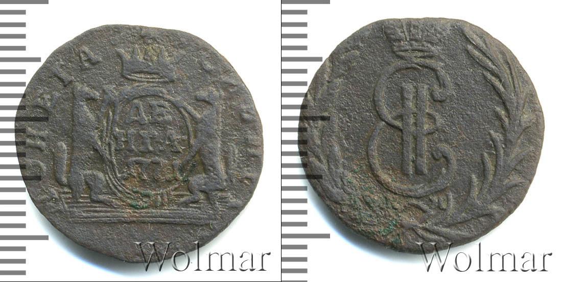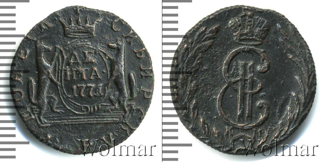 Слева вдоль канта выгравировано: «МОНЕТА», а справа «СИБИРСКАЯ». В центре мы видим двух соболей, удерживающих щит. На нем указаны номинал и дата эмиссии партии «ДЕНГА 1771». Вверху по центру изображен крест, а под ним корона.