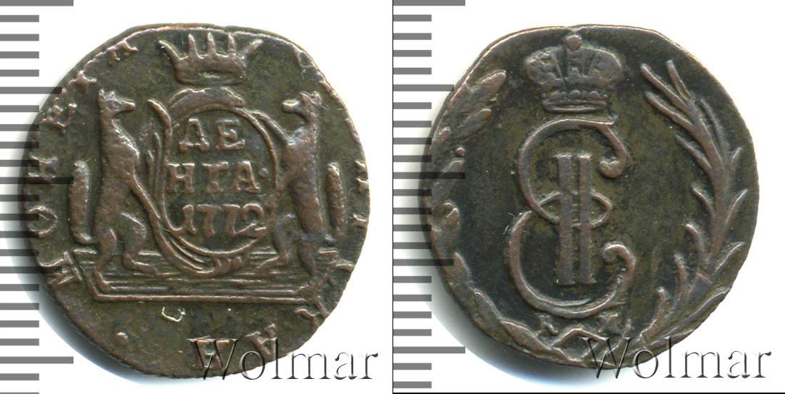 По центру диска изображены два соболя, которые держат щит с отметками о номинале и дате эмиссии монеты «ДЕНГА 1772». Изображение обрамляют две надписи. Слева выгравировано «МОНЕТА», а справа «СИБИРСКАЯ».