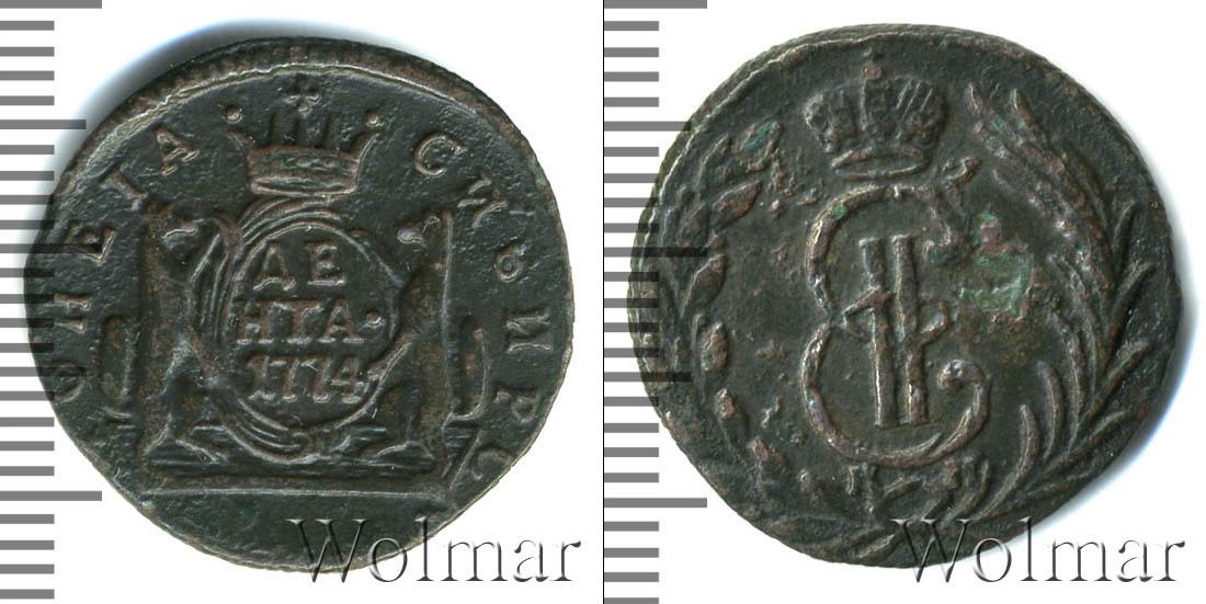 Изображены два соболя, удерживающие щит с надписью «ДЕНГА 1774». Это указание на номинал и дату эмиссии монеты. Вверху по краю мы видим крест, а под ним изображением короны. Также на диске расположена надпись: «МОНЕТА СИБИРСКАЯ».