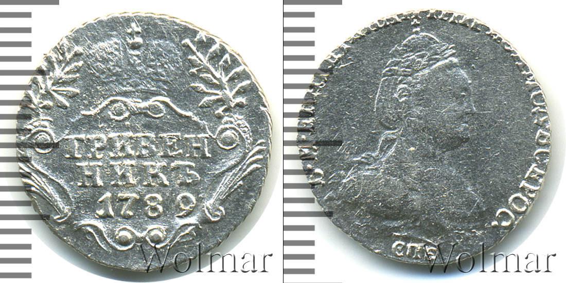Большую часть диска монеты занимает узорчатый щит с лавровыми и пальмовыми ветвями. Вверху Большая корона Российской Империи. Под ней в три строки начертано: ГРИВЕННИКЪ 1789. Это указание на номинал и год выпуска партии монет.
