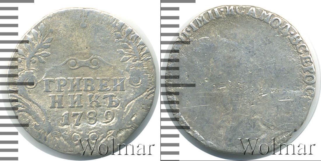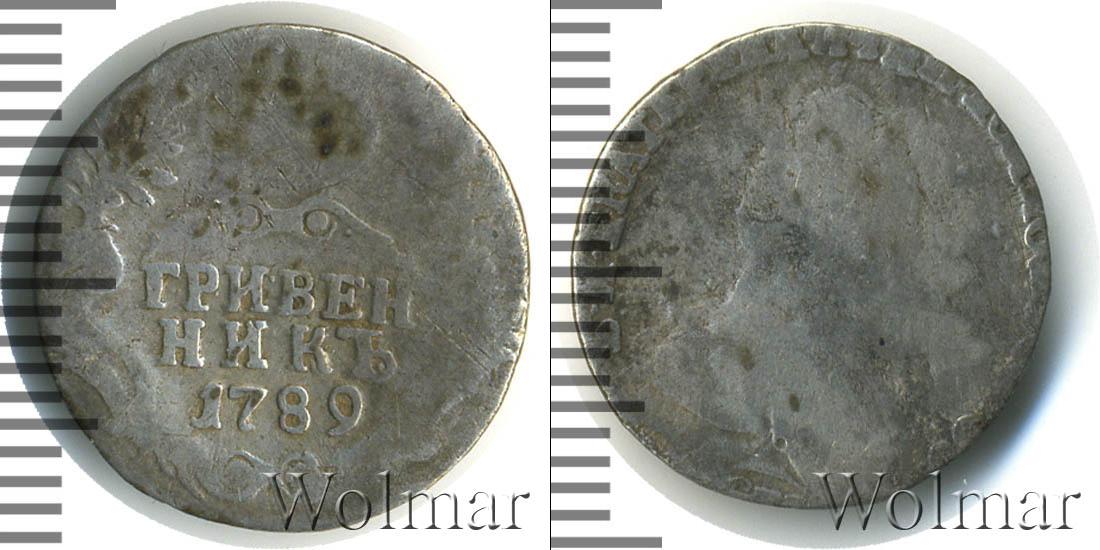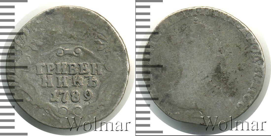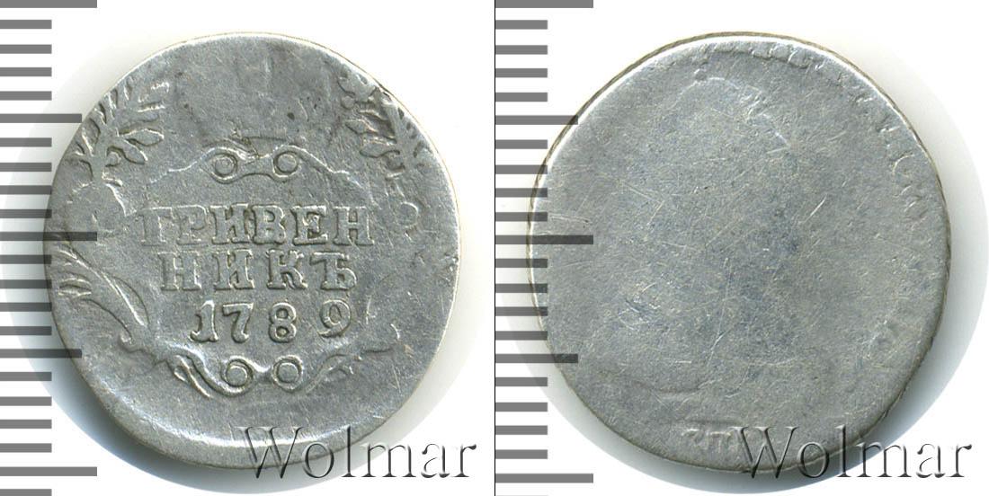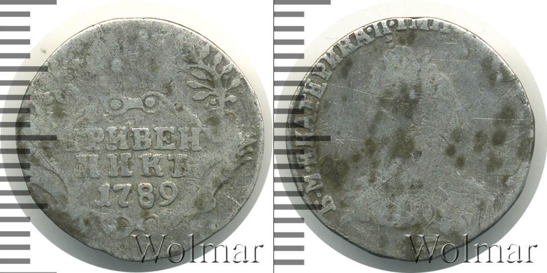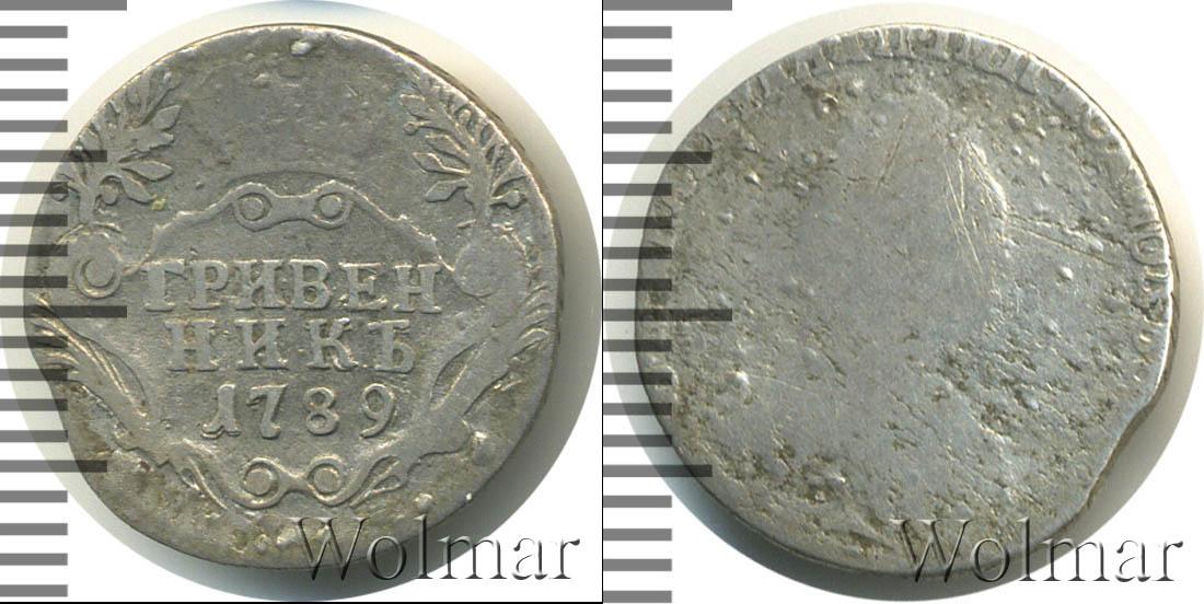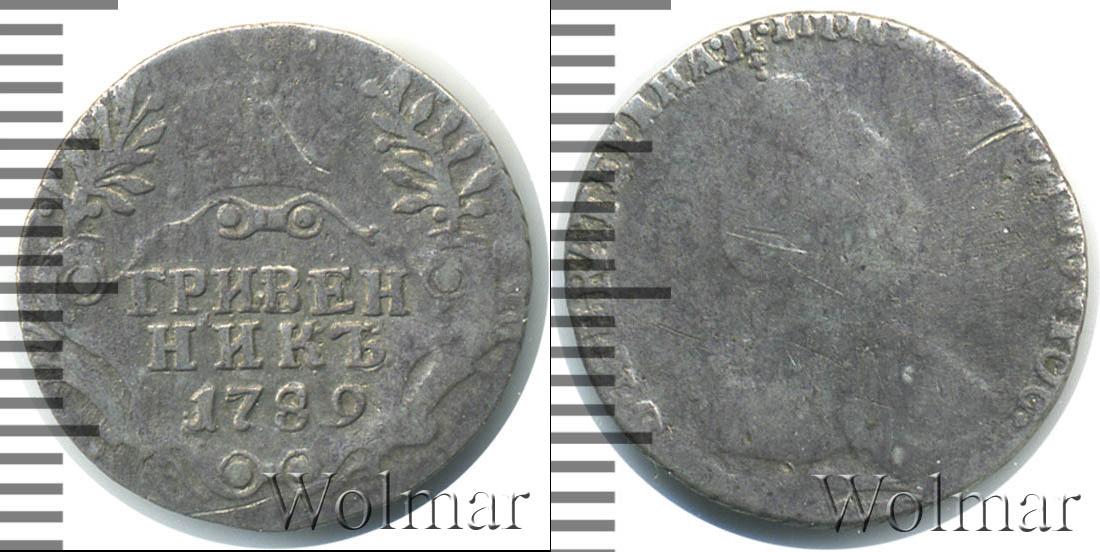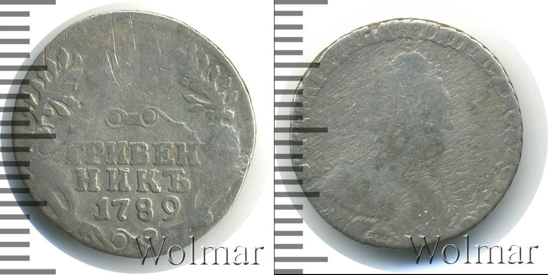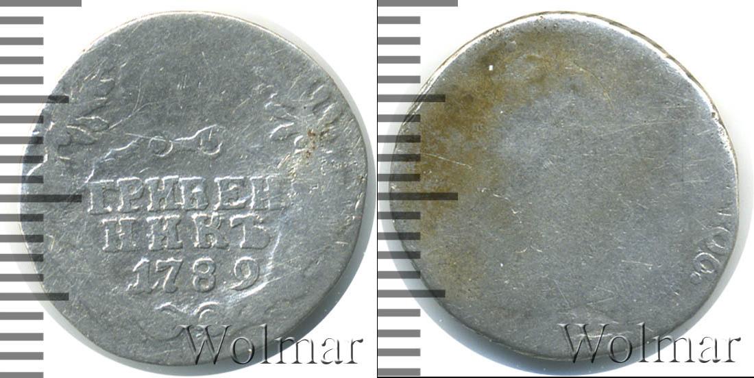 Большую часть диска монеты занимает узорчатый щит с лавровыми и пальмовыми ветвями. Вверху Большая корона Российской Империи. Под ней в три строки начертано: ГРИВЕННИКЪ 1789. Это указание на номинал и год выпуска партии монет.