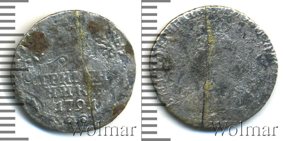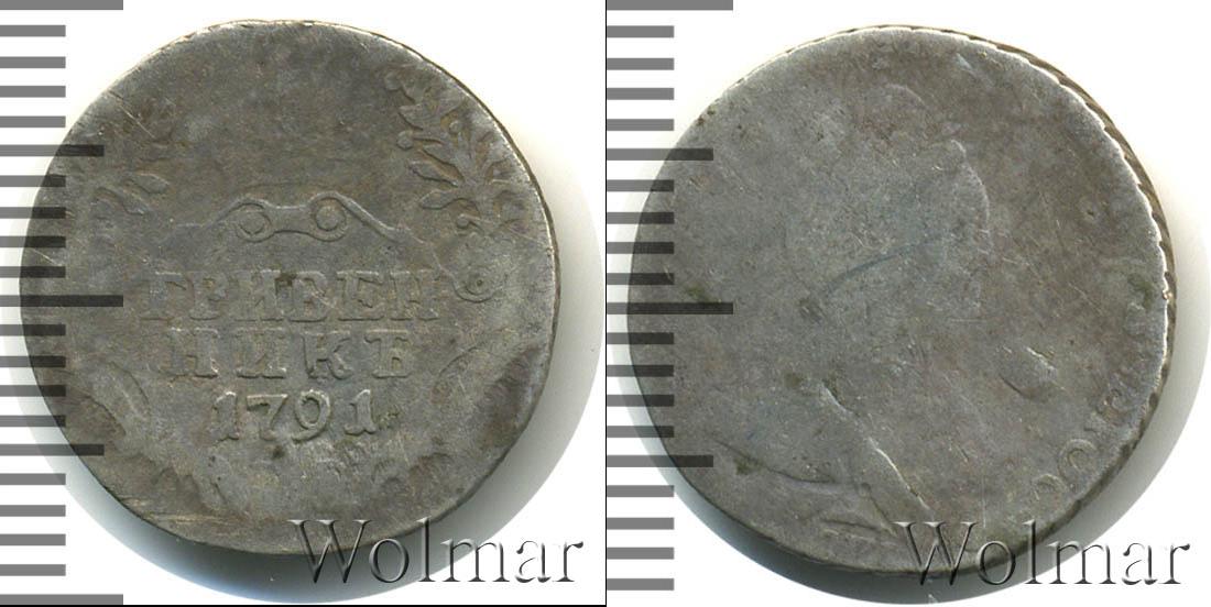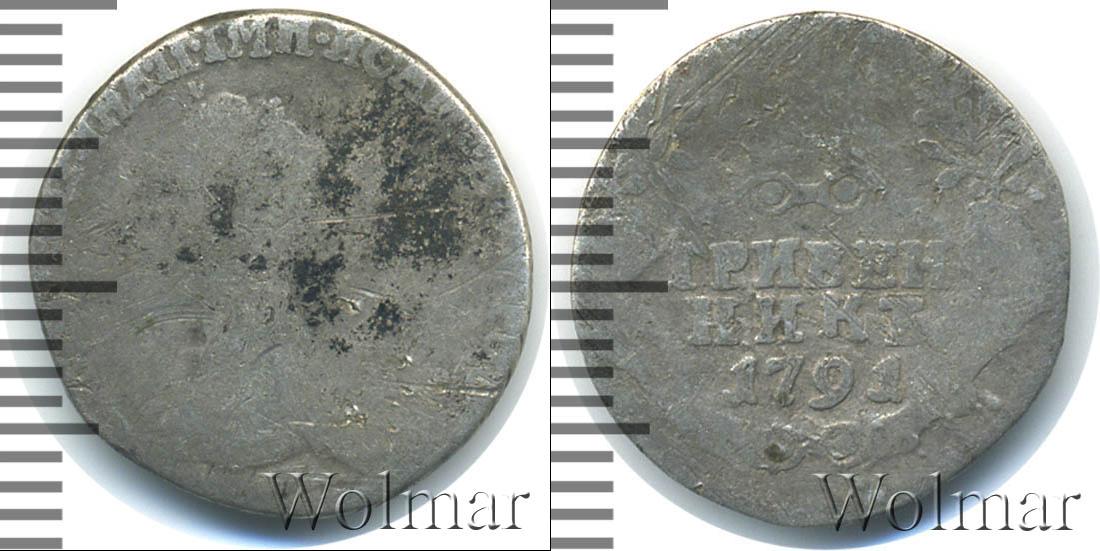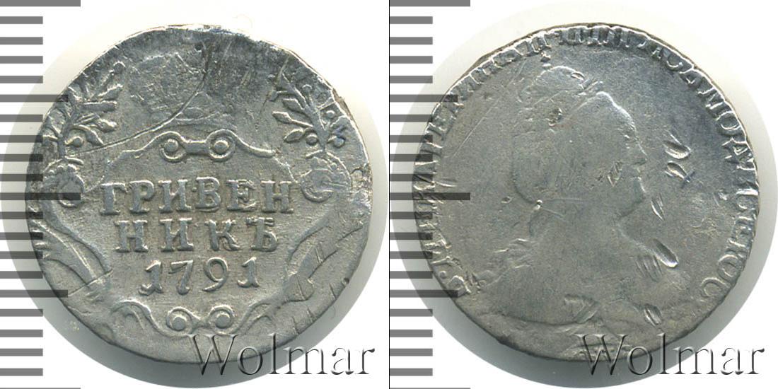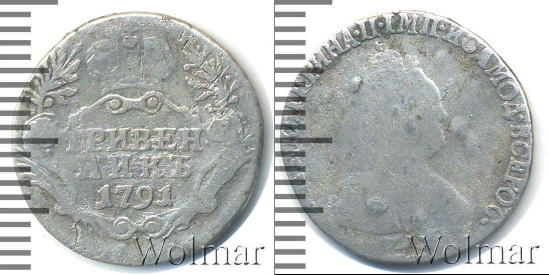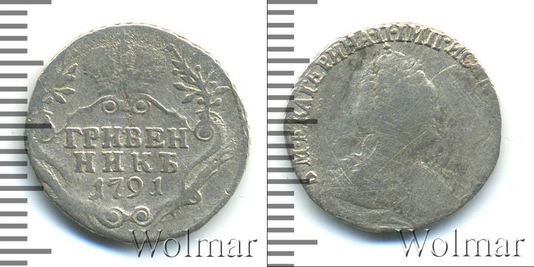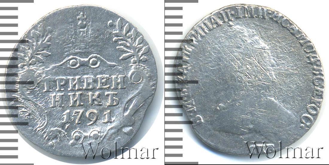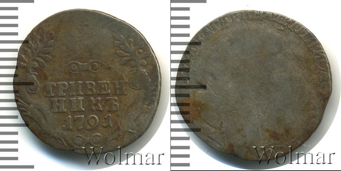 Вверху по центру детально прорисованная Императорская корона России. Слева и справа ее обрамляют лавровые ветви. Внизу сделаны отметки о номинале и дате эмиссии «ГРИВЕННИК 1791». Надпись с каждой стороны украшают пальмовые ветви.