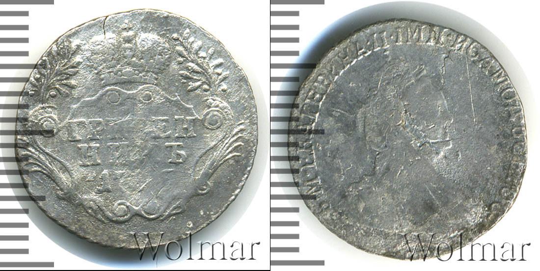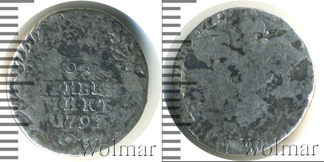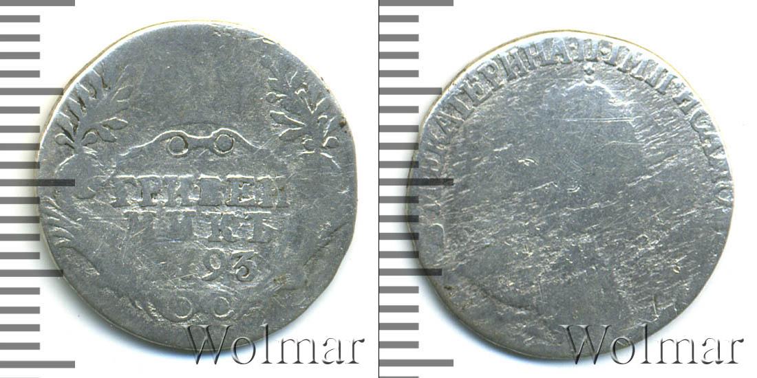 По центру диска мы видим узорчатый щит, в верхней части которого Императорская корона России. Слева и справа от нее лавровые ветви. Внизу отметки о номинале и дате эмиссии монеты «ГРИВЕННИК 1793» (их обрамляют две пальмовые ветви).