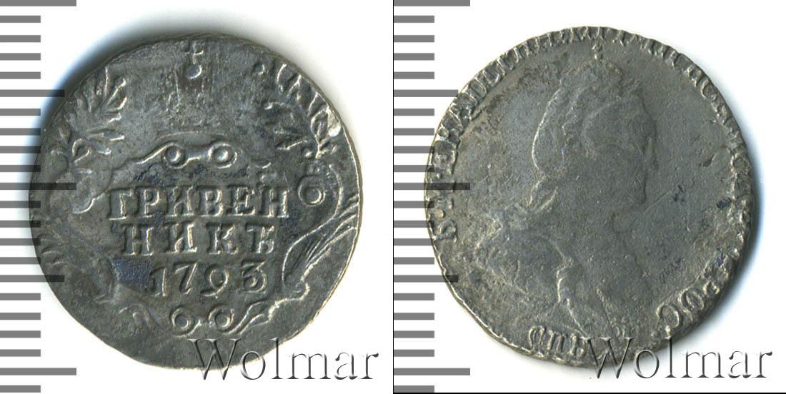 По центру диска мы видим узорчатый щит, в верхней части которого Императорская корона России. Слева и справа от нее лавровые ветви. Внизу отметки о номинале и дате эмиссии монеты «ГРИВЕННИК 1793» (их обрамляют две пальмовые ветви).
