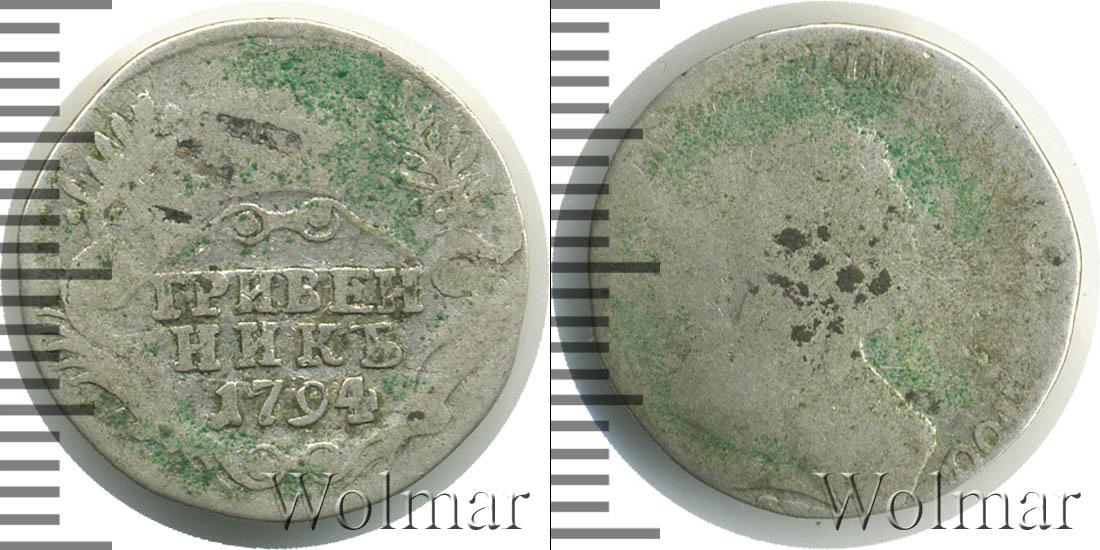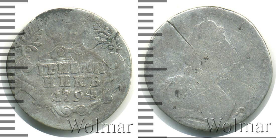 Серебряная монета украшена зубчатым ободком по краю (как и с лицевой стороны). Внутри узорчатого щита изображена Императорская корона России. Она венчает надпись «ГРИВЕННИК 1794». Это номинал и дата эмиссии монеты. На диске также расположены две пальмовые и две лавровые ветви.