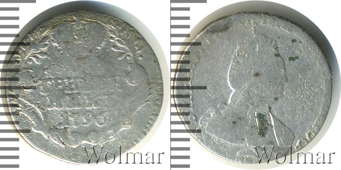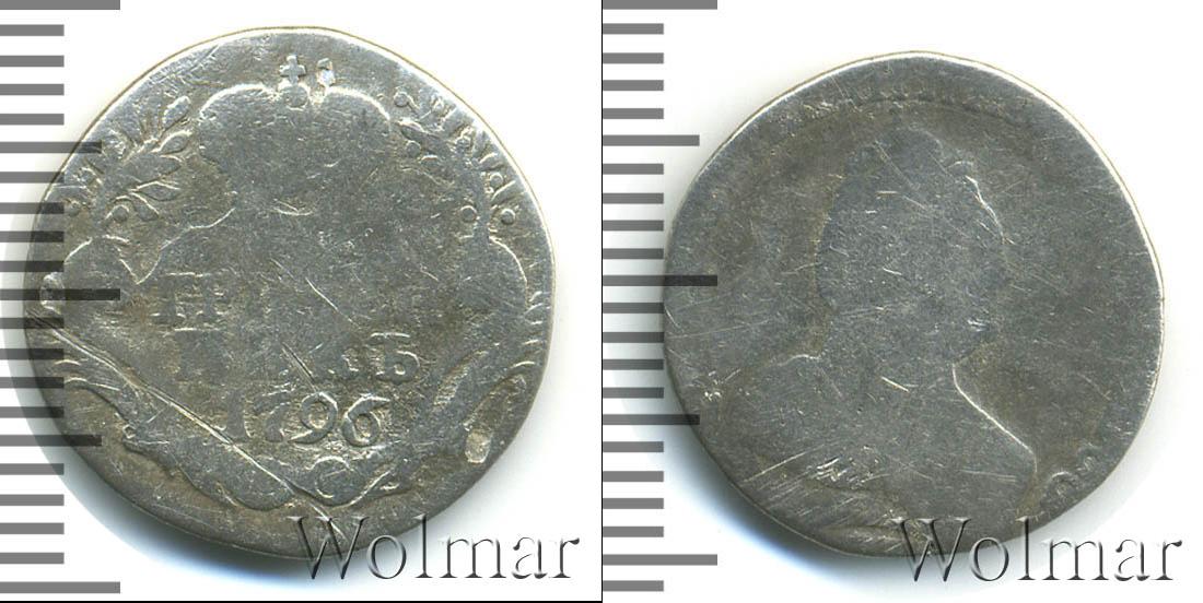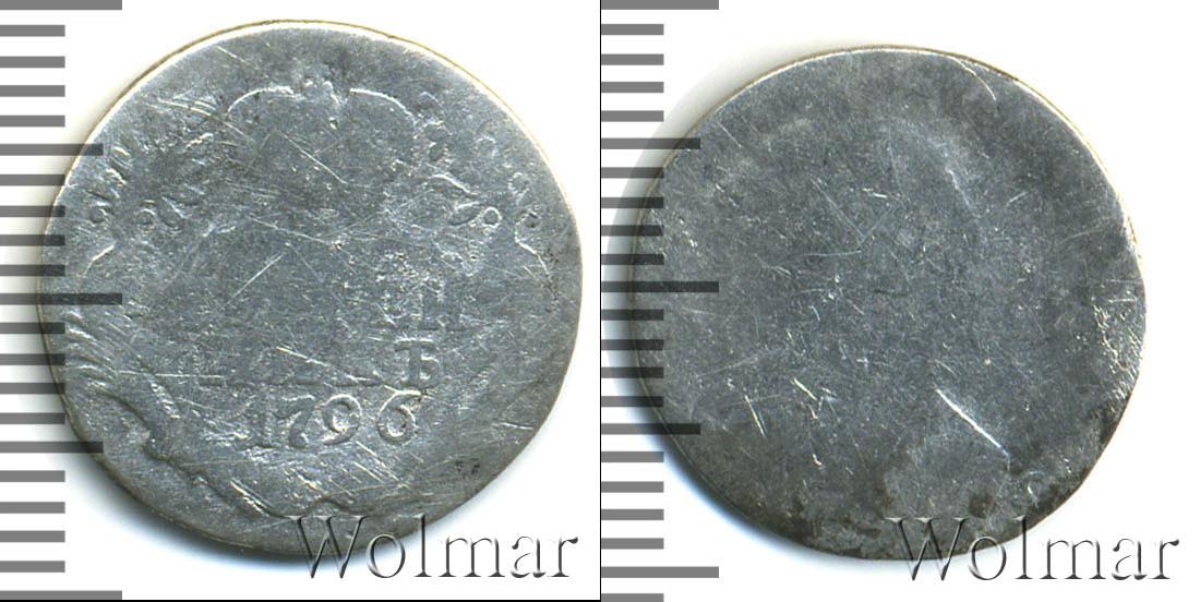 С оборотной стороны монеты отмечены номинал и дата эмиссии: ГРИВЕННИК 1796. Вверху изображена Императорская корона России в обрамлении двух лавровых веток. В нижней части диска щит украшают две пальмовые ветви, а по краю идет узор из множества зубцов.