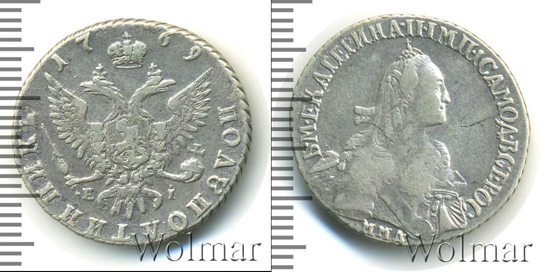 Вдоль нижнего полукруга заглавными буквами указан номинал. Надпись «ПОЛУПОЛТИННИКЪ» выгравировано радиально. В верхней части информационный круг замыкает год эмиссии. Надпись «1769» разделена пополам и выгравирована по обе стороны от имперской короны. Символ монархии покрывает головы геральдического символа Российской Империи. Государственная эмблема занимает центральную часть диска. Под ней указаны инициалы минцмейстера Егора Иванова.