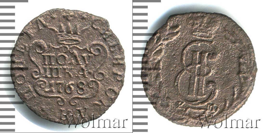 С этой стороны монеты отчеканен картуш в обрамлении узоров. На нем указаны номинал и год выпуска партии «ПОЛУШКА 1768». Вверху показана Имперская корона России. Вдоль канта слева и справа части надписи «МОНЕТА» и «СИБИРСКАЯ».